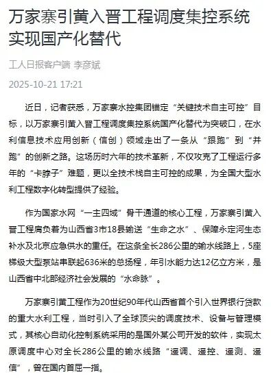據了解,萬家寨引黃入晉工程自動化控制系統作為上世紀90年代山西省首個引入世界銀行貸款的重大水利工程,其核心自動化控制系統采用的是某外國公司開發的軟件?!半S著工程持續運行和調度要求不斷提高,原有系統逐漸暴露出諸多弊病,特別是關鍵設備和軟件依賴進口,存在潛在供應鏈安全風險?!比f家寨引黃水務集團擴機項目部計算機監控系統項目負責人張皓宇說,在硬件方面,關鍵組件嚴重老化,備件采購與技術服務成本居高不下,對進口依賴度高;系統軟件因泵站機組分三期建設,加之20多年來多批局部改造,系統的軟件架構、數據結構和工控協議不統一,多個系統形成“各自為戰”的信息孤島。
