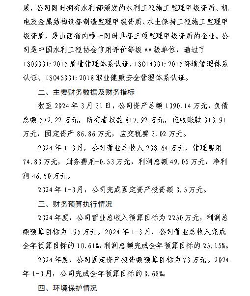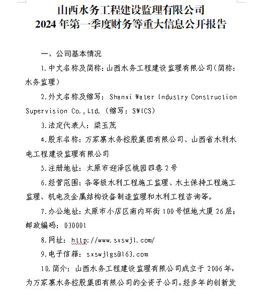 山西萬家寨引黃水務集團有限公司2024年第一季度信...